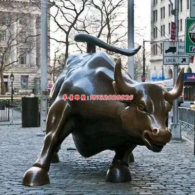 华尔街铜牛是美国华尔街的标志,1989年铸成并安放在纽约证券交易所门前,最后被搬到与华尔街斜交的百老汇大街上。它是力量和勇气的象征,寓意着只要铜牛在,股市就能永保牛市。铜牛的设计者,来自意大利西西里岛的艺术家莫迪卡,想做一件作品一鸣惊人,于是开始构思并制作了这尊铜牛。他也因为铜牛的问世而真的闻名遐迩了。世界上很多金融中心、股票交易市场都纷纷模仿,雕塑了一尊尊铜牛。而且,模仿中也不乏创新之作。这些新塑的铜牛也是各有特色,有的奔驰疾驶,有的仰首冲天,有的持高傲物。在人们的想象中,留住了铜牛,也就是留住了财富。于是有的人还把铜牛用铁链锁住,希望它永远驻留此地,效忠主人。